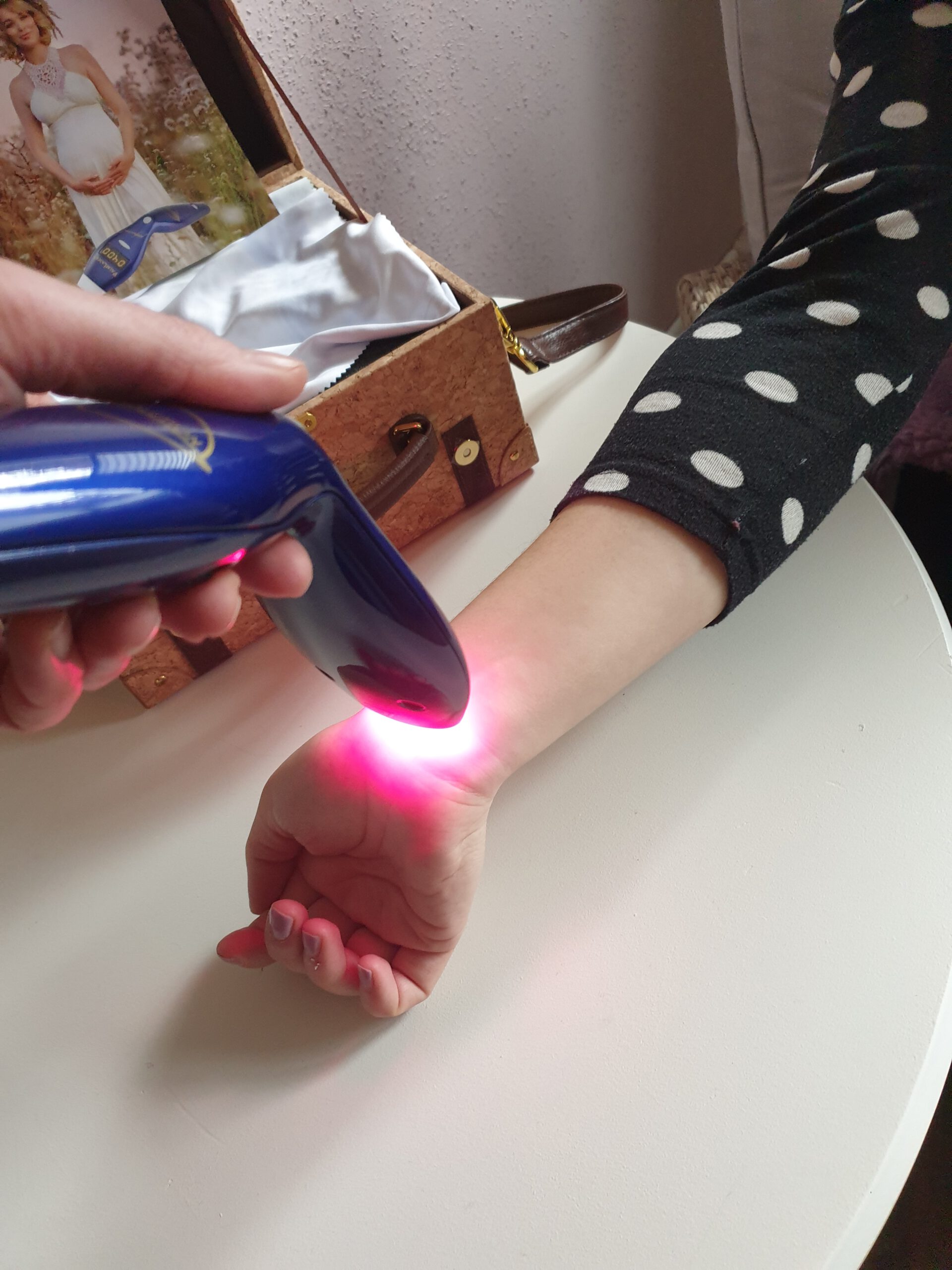 Laser-Phototherapie – Die sanfte und effiziente Therapie bei Wunden, Entzündungen, Narben und Schmerzen. Der eingesetze Niedrigenergielaser nimmt positiven Einfluss auf körpereigene biochemische Prozesse in den Zellen, die eine beschleunigte Wundheilung unterstützen, Entzündungen abbauen und folglich Schmerzen reduzieren. Typische Anwendungsbereiche in Schwangerschaft und Wochenbett: Karpal-Tunnel-Syndrom (siehe Bild), Nackenverspannungen, Kreuzbeinbeschwerden, Hämorrhoiden, wunde Brustwarzen, Milchstau, Mastitis, Wundheilung Sectionaht/Dammnaht uvm. Weitere Informationen und Terminvergabe unter info@hebammenpraxis-biedenkopf.de oder 064617579041